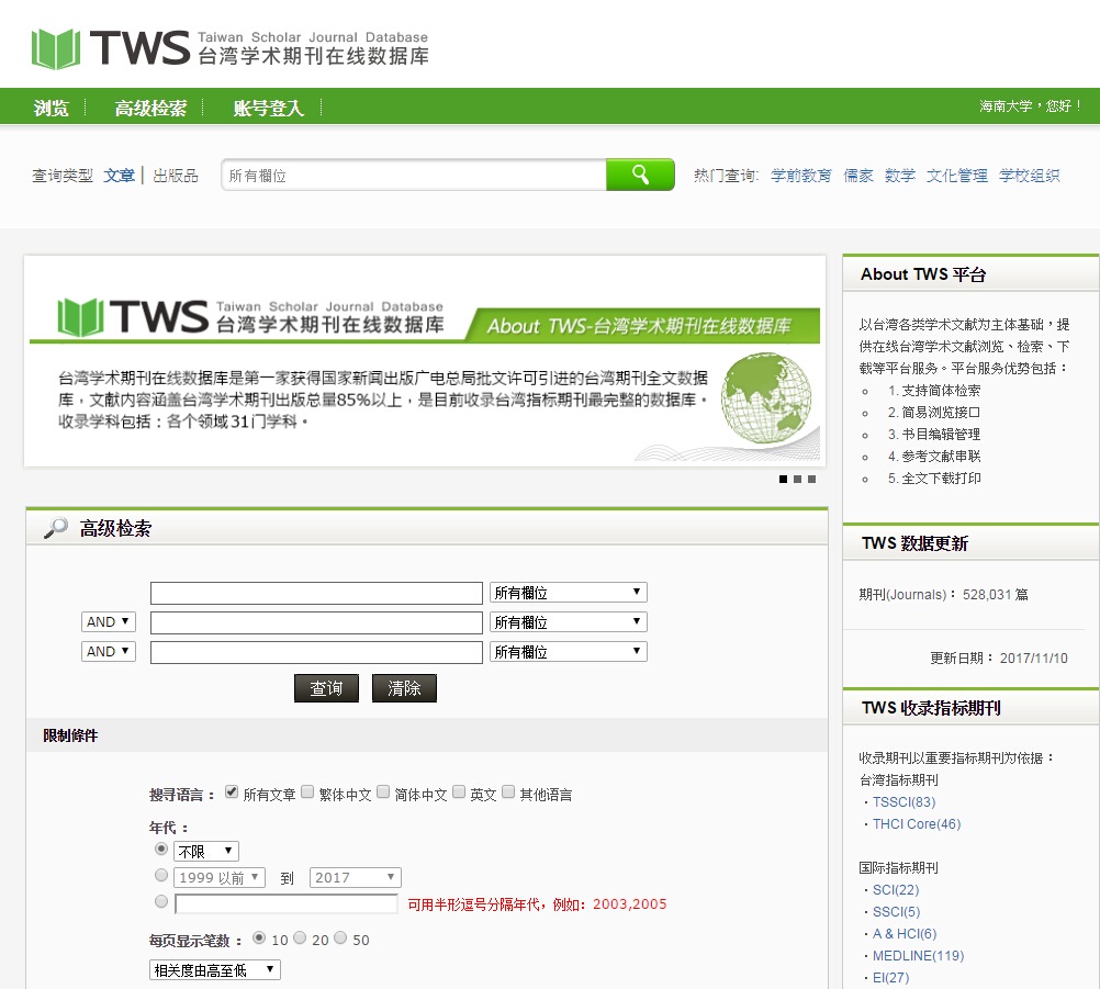 数据库简介:台湾学术期刊在线数据库是第一家获得国家新闻出版广电总局批文许可引进的台湾期刊全文数据库,是目前收录台湾指标期刊最完整的数据库。期刊内容涵盖台湾学术期刊出版总量的85%以上,收录31个类目50多万篇学术期刊论文。