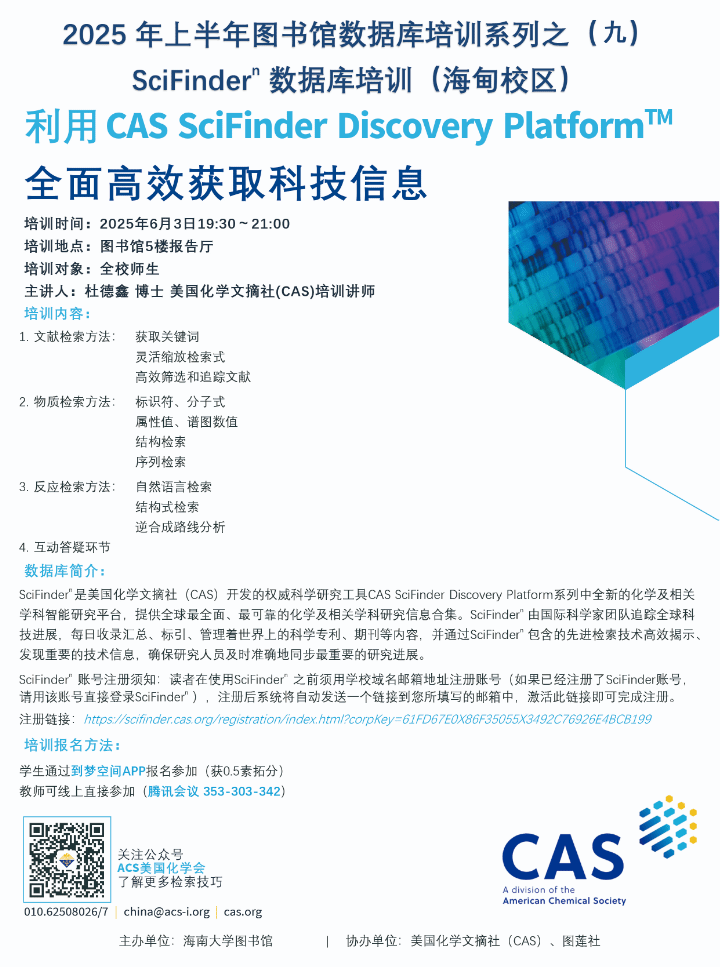 培训主题:利用CAS SciFinder Discovery Platform 全面高效获取科技信息