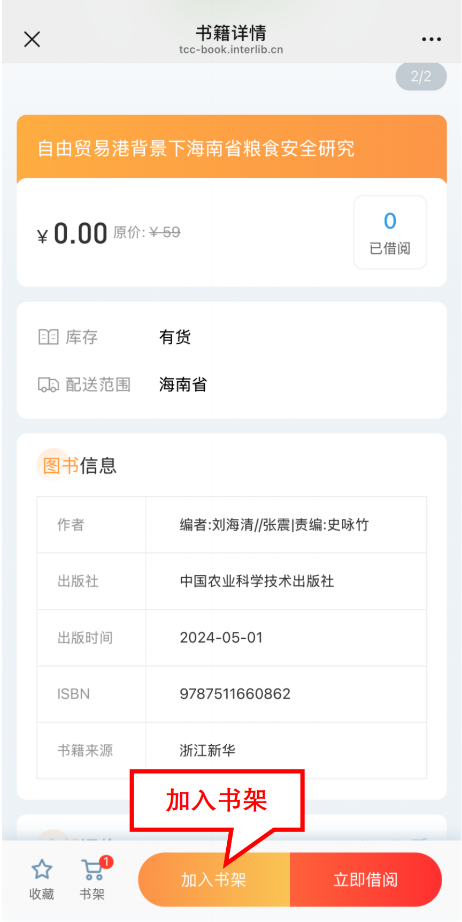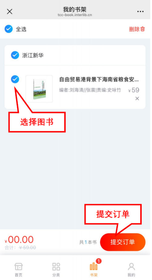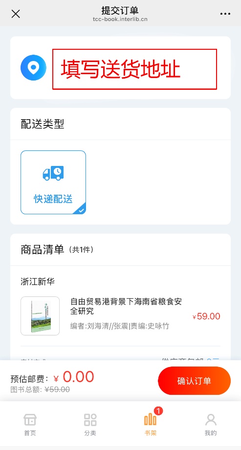4.点击“我的书架”,选择所需图书,填写送货地址,并确认订单;