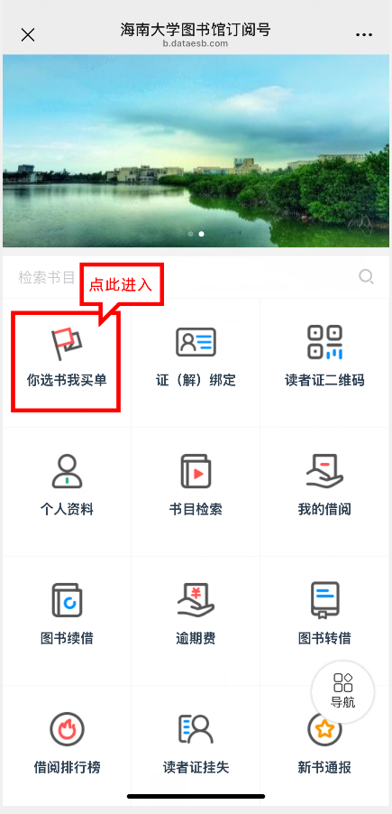 2.从海南大学图书馆订阅号--微服务大厅,选择:“你选书我买单”;