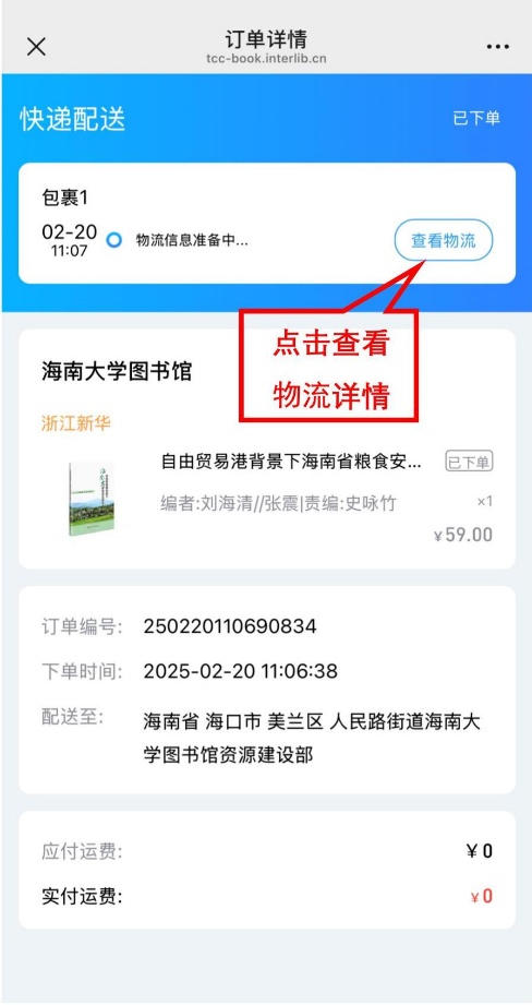 5.确认收货,订单签收后,将在读者的“海大e卡”上形成借书记录,海南大学图书馆订阅号将向你发送借书信息;