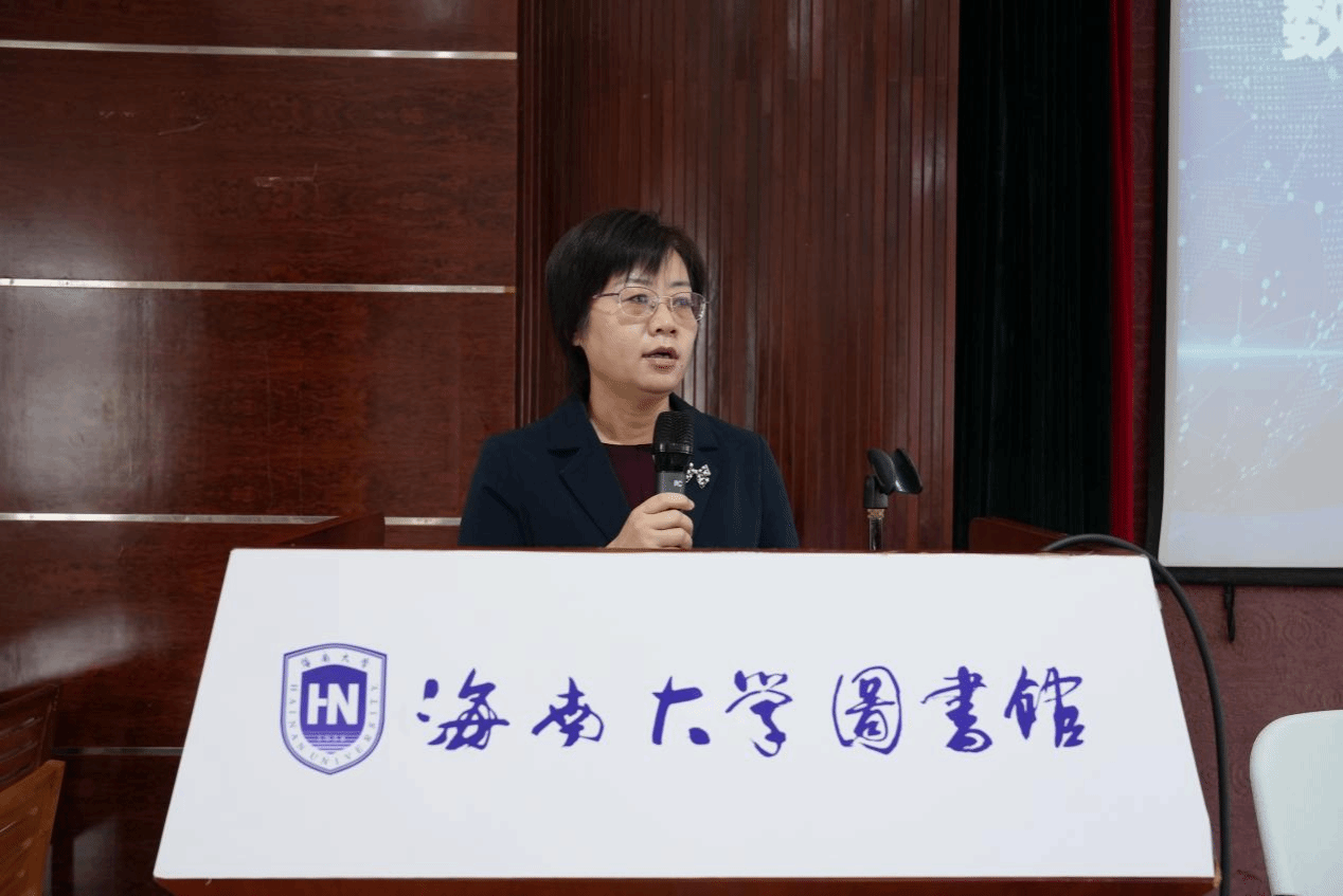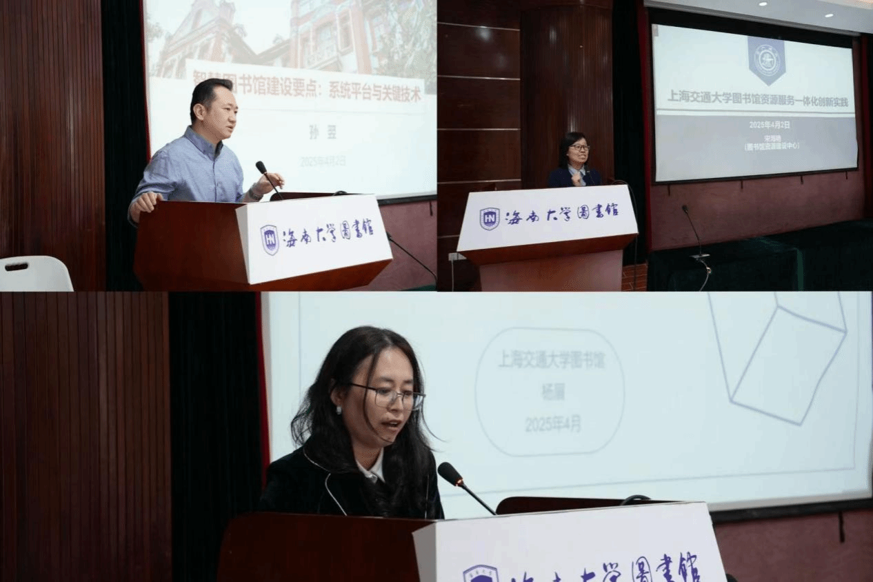 会议第三阶段是专题报告,由省高校图工委副主任、海南省教育科研数字图书馆常务副馆长、海南陵水黎安国际教育创新试验区图书馆馆馆长王小会主持。上海交通大学图书馆系统技术与空间服务中心主任孙翌作了“智慧图书馆建设要点:系统平台与关键技术”的报告。报告从“什么是智慧图书馆”的多种认识视角阐述开始,对AI赋能高校教育已势不可当的现状及上交大图书馆基于管理系统、终端等应对人工智能时代的思考和多项实践工作方案作了详细介绍。上海交通大学图书馆资源建设中心宋海艳主任介绍了图书馆资源服务一体化工作实践。阐述了资源服务一体化发展需求和背景、逻辑内涵、发展目标、行动计划、发展路径等内容,最后指出了图书馆资源和服务作为一个统一的服务体,需要认真思考如何强化图书馆要素之间的增值赋能。上海交通大学图书馆原学科服务部主任、副研究馆员杨眉博士作了“AI赋能图书馆信息素养教育初探”报告。从AI时代图书馆开展学术信息素养教育的必要性、AI+课程探索、学术信息素养教育实践、AI赋能阅读推广及未来AI将融入学习过程、嵌入专业课程等内容作了介绍。