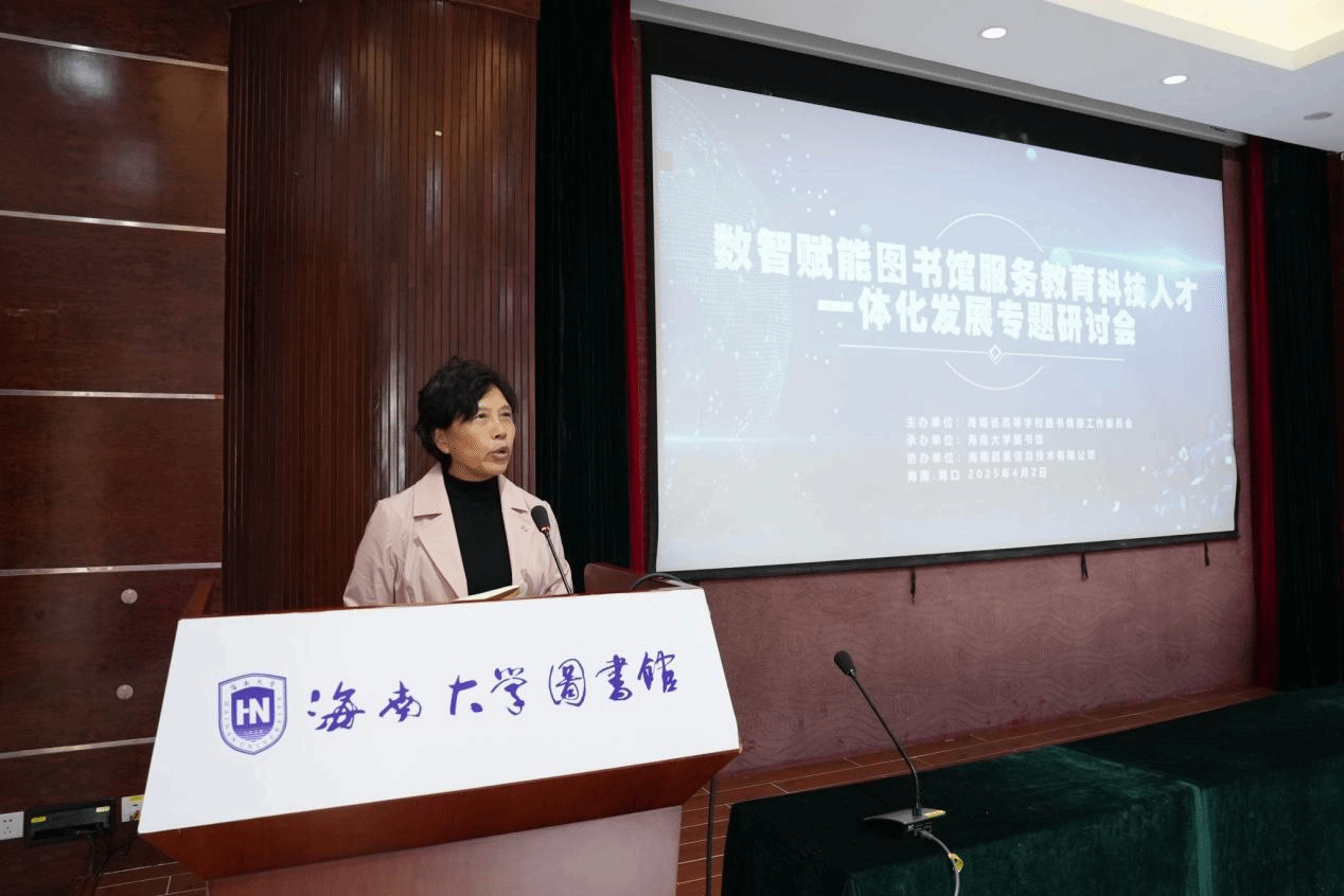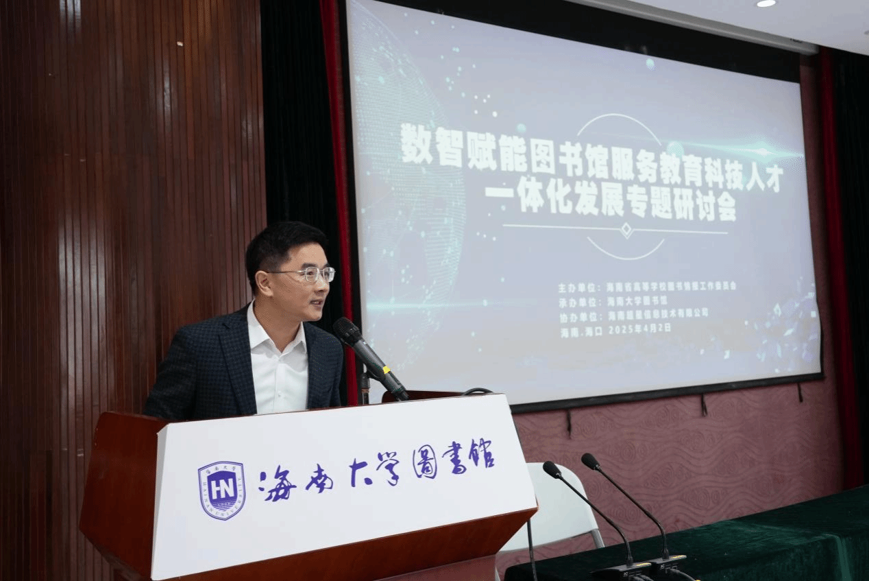 高校是教育、科技、人才的集中交汇点,在推进教育、科技、人才“三位一体”协同融合发展中发挥着关键作用。高校图书馆作为数据信息与知识服务的汇聚枢纽,应当有所作为。为进一步提升海南省高校图书馆人才队伍的综合素质,拓宽馆员专业视野,推动跨界合作,激发创新活力,为高校图书馆“十五五”规划谋篇布局,狠抓历史机遇,共同应对挑战,海南省高等学校图书情报工作委员会于2025年4月2日在海南大学图书馆举办“数智赋能图书馆服务教育科技人才一体化发展”专题研讨会。教育厅领导、校领导、特邀专家、全省高校图书馆馆领导及业务骨干、嘉宾等近150人参加了会议。本次会议同时开通腾讯直播,省内高校图书馆数十名老师通过线上方式参加学习。