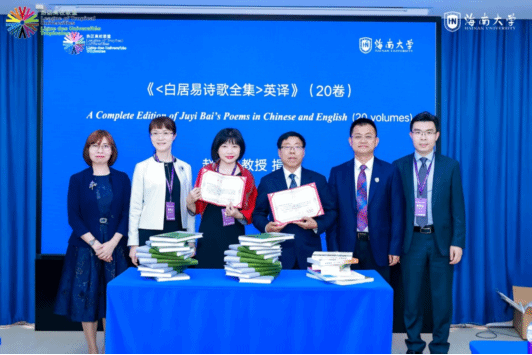 会上介绍了赵彦春教授的《<白居易诗歌全集>英译》(20卷)译著和衣若芬教授的《五声十色:文图学视听进行式》等6种6册专著,是捐赠人在文化学术领域多年潜心研究的成果,其中赵彦春教授对古典诗词的英译十分讲究贴合原文、用词严谨、音韵和谐,衣若芬教授的《五声十色:文图学视听进行式》《大有万象:文图学古往今来》《东张西望:文图学与亚洲视界》分别入选文图学会2021、2022、2027年国际研讨会论文集、《游目骋怀:文学与美术的互文与再生》获选南京大学世界文学图像研究推荐书、《星洲创意:文本、传媒、图像新加坡》入选新加坡艺术研究与联合早报推荐2023年十大好书、《艺游狮城:翻看新加坡美术手帐》成为新加坡博物馆美术馆文化遗产研究科普读物。这些赠书将充实海南大学图书文献资源的馆藏建设,让读者受益。
