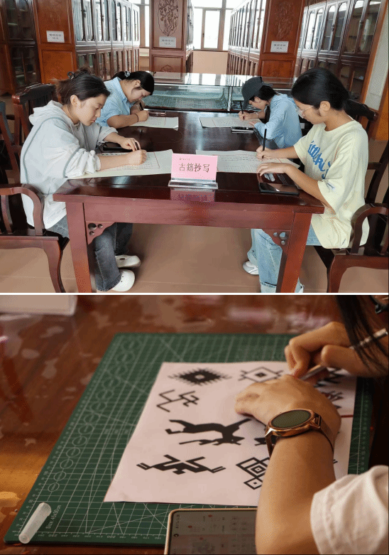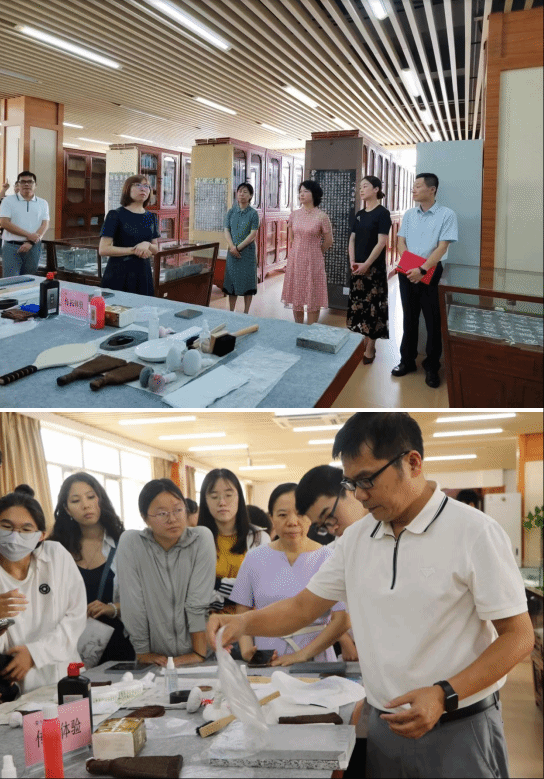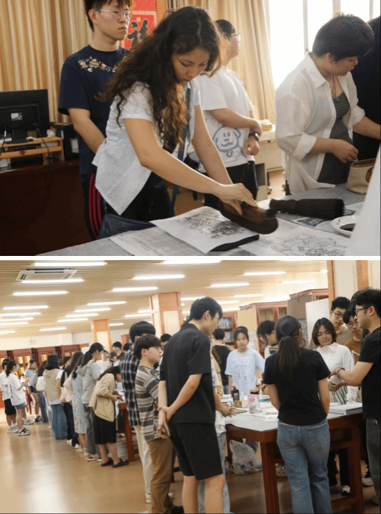 中外学生饶有兴致地进行了传拓、雕版印刷、刻纸、古籍抄写(古文抄写纸由国家古籍保护中心提供)等体验。
