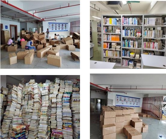 读者服务部副主任支小婷现场统筹协调搬迁公司,分类下架图书143,739册(打包2,221箱),拆解196列书架,迁移空调及家具等设施。5月4日,全部图书按时有序搬迁至观澜湖校区图书馆。137张阅览桌椅、60张双人位电脑桌椅搬迁至海甸校区图书馆,为“学在海大”助力。本次搬迁,对需报废的家具等资产,按照有关要求进行报废处理。