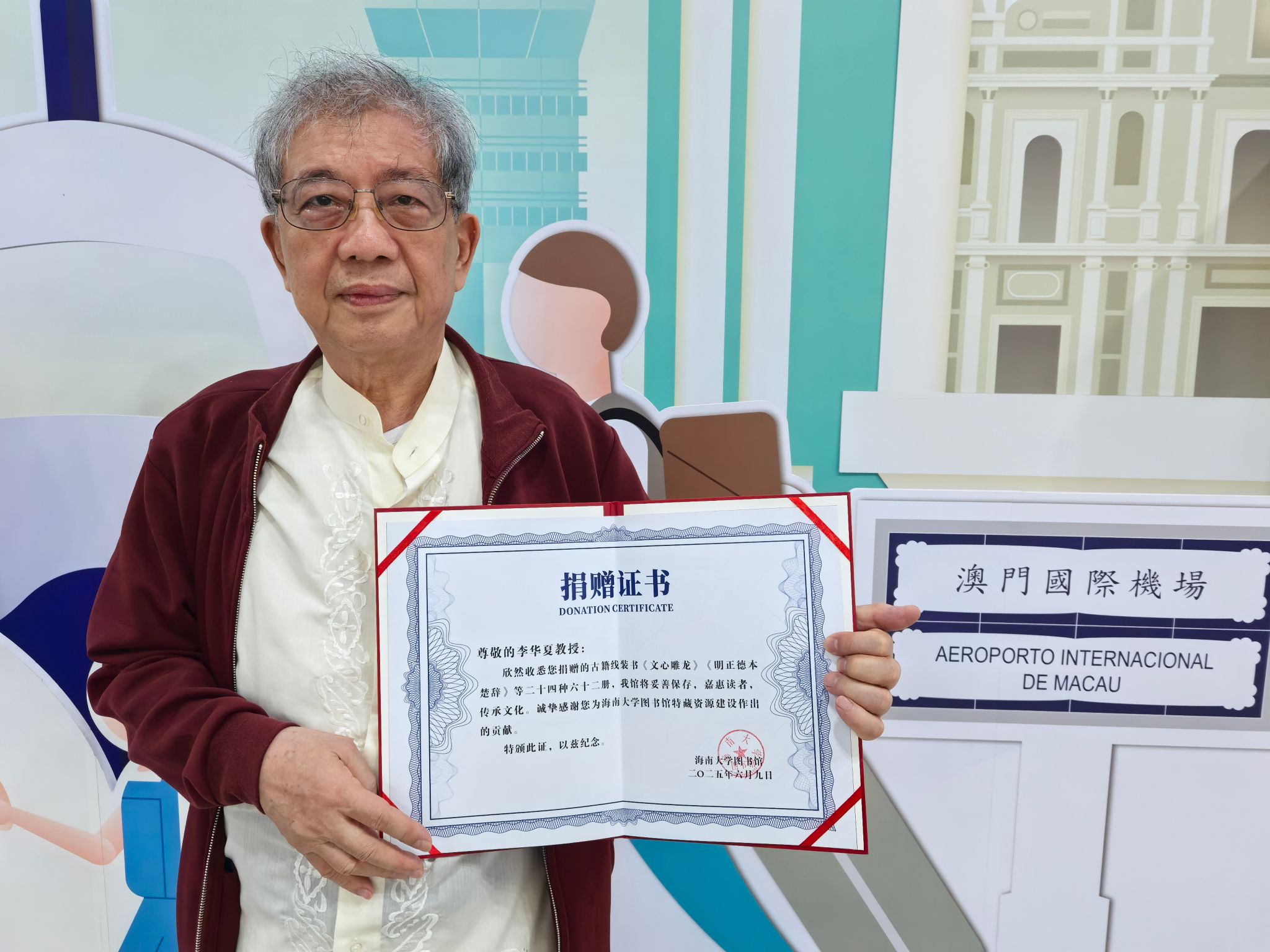 近日,受海南大学校友会委托,海南大学2009级校友胡贵双先生专程从广东内地赴澳门机场,协同海南省外事办人员接受台湾学者李华夏教授捐赠古籍线装图书一批,现场对图书进行拍照和清点册数,并将接收图书交付澳门物流公司。此次捐赠成功交接为我馆开展异地接受境外捐赠图书提供工作范例。
