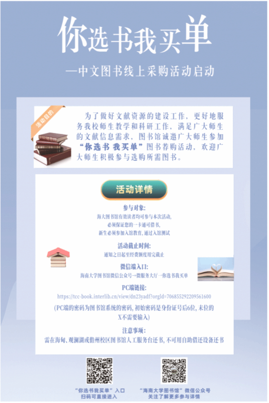 2025年上半年,图书馆通过微信公众号、网站、电子邮件、微信群、课堂等渠道宣传推介“你选书▪我买单”图书荐购活动,深受广大师生的喜爱和积极参与。截止6月底,共有543位师生参与此活动,购买图书3211册。该活动很好地满足了我校师生对个性化图书的需求。欢迎广大师生继续关注。