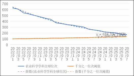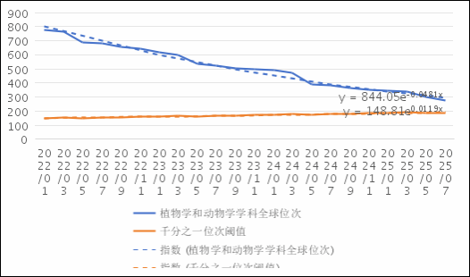 我校9个ESI学科的国内外机构排名具体情况如表2所示,表中排名位置比越小,说明学科排名越靠前。在国内外排名中,我校农业科学学科国际排名为166,位置比为12.21%,与本期进入全球排名前1‰ 的135家机构相比,还有31位次的差距。植物学和动物学学科国际排名为280,位置比为14.61%,与本期进入全球排名前1‰ 的191家机构相比,还有89位次的差距。根据当前的发展态势进行预测(图1和图2),农业科学学科有望2026年1月进入ESI全球前1‰ ;植物学和动物学学科有望2026年9月进入ESI全球前1‰ 。