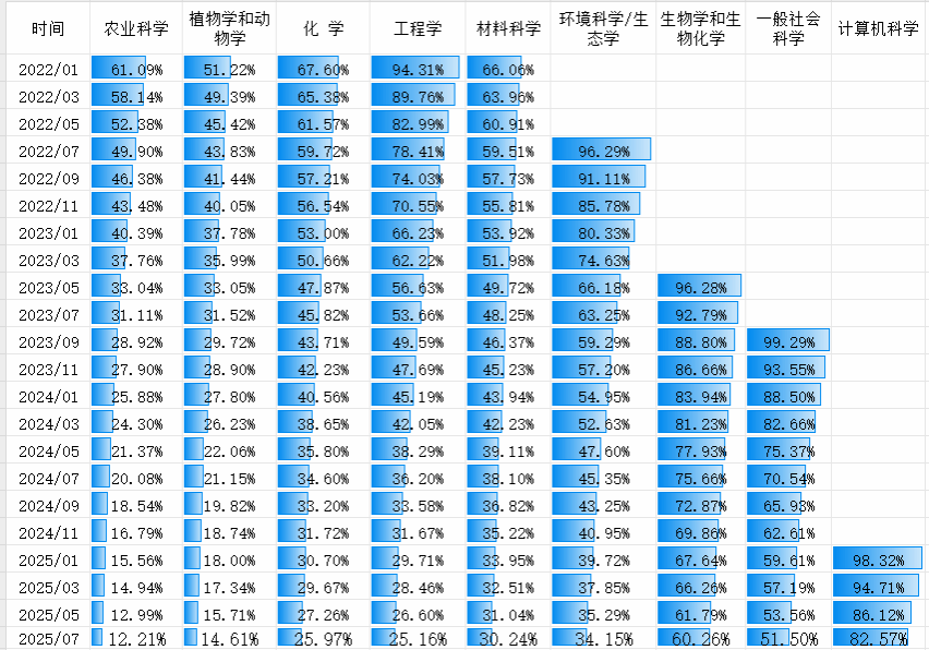 图3 海南大学ESI学科全球排名位置比(2022.01-2025.07)