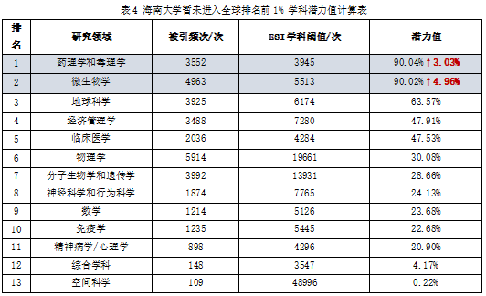 利用ESI和InCites数据库提供的相关学科数据,对我校未进入全球排名前1% 的ESI学科进行预测。预测采用了两项数据:一是ESI数据库中学科的阈值(2025年7月11日检索);二是InCites数据库中海南大学2015-2025年的22个ESI学科被引频次(2025年7月11日检索)。利用2025年7月份更新的数据,对被引频次与学科阈值的比值进行潜力值计算(潜力值=某机构某学科论文总被引频次/该学科进入全球前1% 最后1名机构的总被引频次(阈值),当某学科的潜力值达到或超过100%时,表示该学科有可能进入ESI全球排名前1%。),各学科潜力值预测详情见表4所示。
