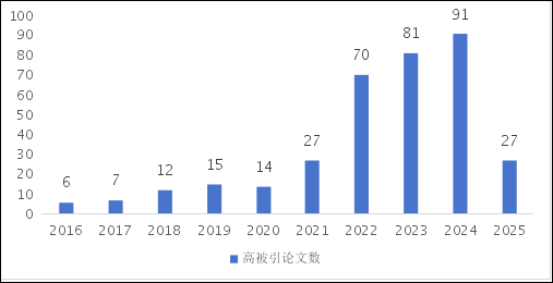 图5 海南大学各年度高被引论文分布图(2016-2025.04)