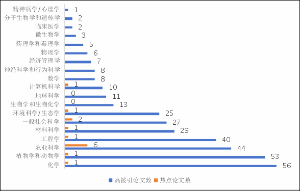 本期对我校2016-2025年各年度的高被引论文进行统计,如图5所示。从图中得知,我校2022-2024年高被引论文数大幅增长,2022年高被引论文达70篇,2023年高被引论文达81篇,2024年高被引论文达91篇,主要分布于化学、植物学和动物学、农业科学、工程学、材料科学、一般社会科学、环境科学/生态学等学科。