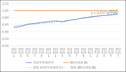 本期药理学和毒理学学科全球共有1370家机构进入全球排名前1%,中国大陆共有145所高校进入全球排名前1%。我校药理学和毒理学学科在全球排名为1463名,与本期进入全球排名前1%的1370家机构相比,还有93位次的差距。我校该学科发文为285篇较上一期(266篇)增加19篇,被引频次为3552次,篇均被引频次12.46次。本期药理学和毒理学学科新晋全球排名前1%的中国大陆高校为中南民族大学、西南交通大学、南京工业大学、嘉兴大学,发文分别为333篇、314篇、260篇、341篇,被引频次分别为3995次、3989次、3972次、3951次,篇均被引频次分别为12次、12.7次、15.28次、11.59次。我校该学科发文量高于南京工业大学,篇均被引频次高于中南民族大学和嘉兴大学,但总被引频次均低于本期新晋全球排名前1%的四所高校。根据当前的发展态势进行预测(图6),药理学和毒理学学科有望2026年3月进入ESI全球前1%。