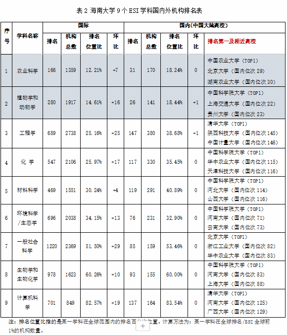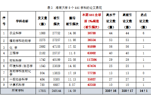 截至目前,我校共有9个学科进入ESI全球前1%,分别是:植物学和动物学(PLANT & ANIMAL SCIENCE)、材料科学(MATERIALS SCIENCE)、化学(CHEMISTRY)、农业科学(AGRICULTURAL SCIENCES)、工程学(ENGINEERING)、环境科学/生态学(ENVIRONMENT/ECOLOGY)、生物学和生物化学(BIOLOGY & BIOCHEMISTRY)、一般社会科学(SOCIAL SCIENCES, GENERAL)、计算机科学(COMPUTER SCIENCE)。
