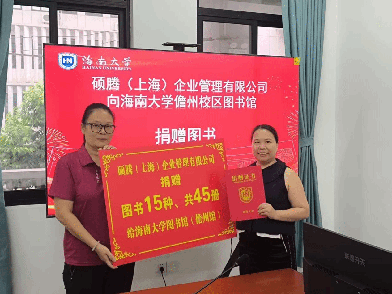 在捐赠仪式上,由硕腾中国技术服务经理钟健敏代表企业向海南大学捐赠专业书籍45册,儋州校区图书馆负责人曹桂琼老师接受赠书,并向钟健敏颁发捐赠证书。
