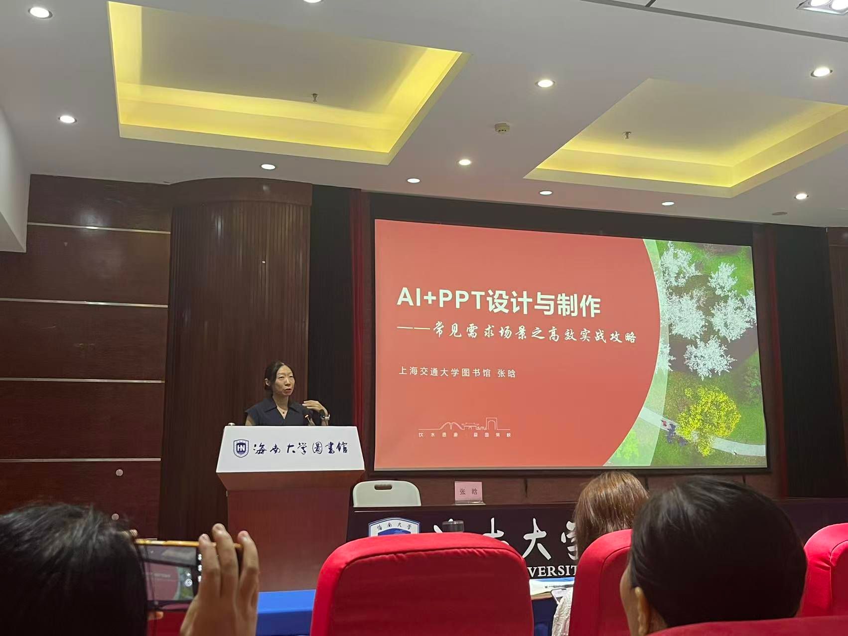 2025年9月17日,海南大学“AI素养训练营”之”AI+工具素养”第一场报告在图书馆顺利举行。上海交通大学图书馆教学支持中心主任张晗担任主讲嘉宾,做题为“AI+PPT设计与制作——常见需求场景之高效实战攻略”的专题讲座。图书馆文献信息管理骨干班成员及师生约两百人参加。