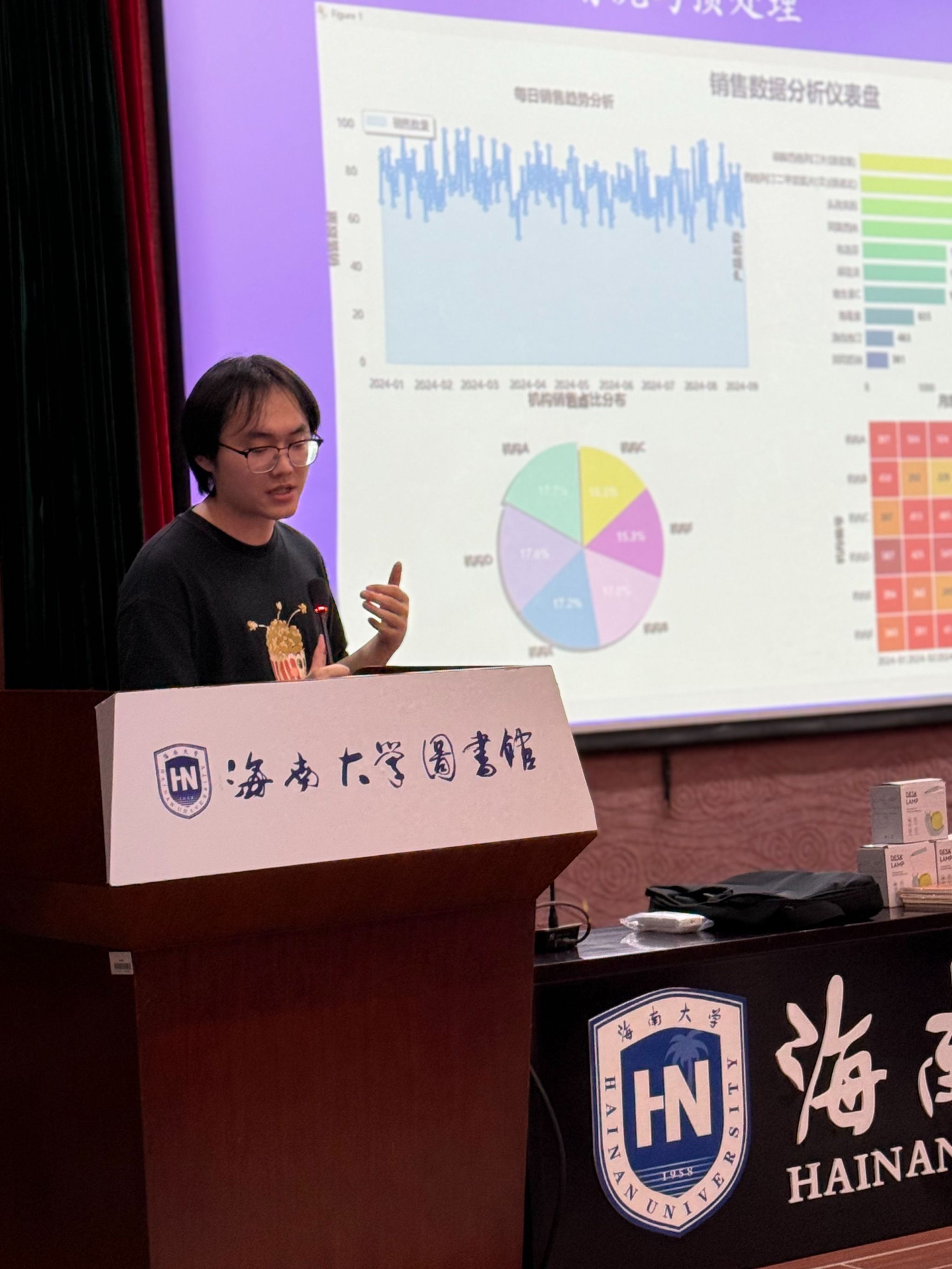 邢奇强同学以“让AI成为你的科研助理”为题,分五大板块讲解,介绍了豆包、DeepSeek等AI工具,结合“海南旅游”“糖尿病药品”案例,演示AI在文献调研、数据分析与可视化等科研环节的应用,还提醒同学们善用AI,遵守学校等相关规定。