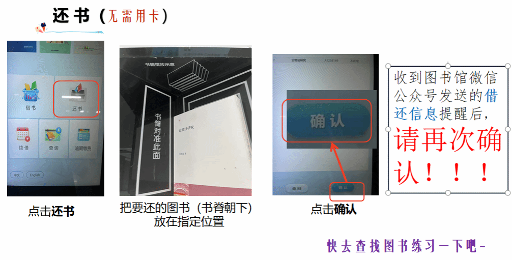 无论借书还书,都必须确认所借还图书准确无误,确认后才能离开。
