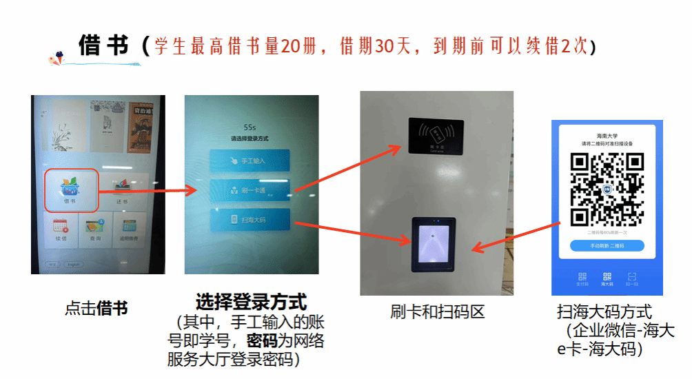 海大读者均可在海甸馆、儋州馆、观澜湖馆借还,借还书可在自助借还机操作,归还其他校区图书可找管理员归还。