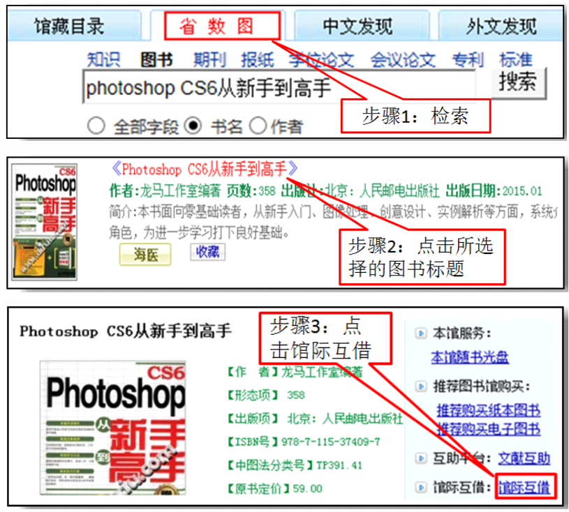 在图书馆主页检索框点“省数图”,输入检索词即可检索全省高校图书馆图书。点击书名进入图书的详细信息页面,在右边点击“馆际互借”。填写提交申请表单后,等待通知取书。借阅期1个月,到期归还至本馆馆际互借员处。