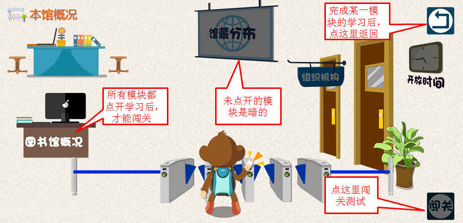 二、进入本馆概况后,逐一点开“图书馆概况”、“馆藏分布”等模块进行学习。完成一个模块的学习,点右上角的返回标志,继续下一个模块学习。完成所有模块学习后,点右下角“闯关”进行测试。